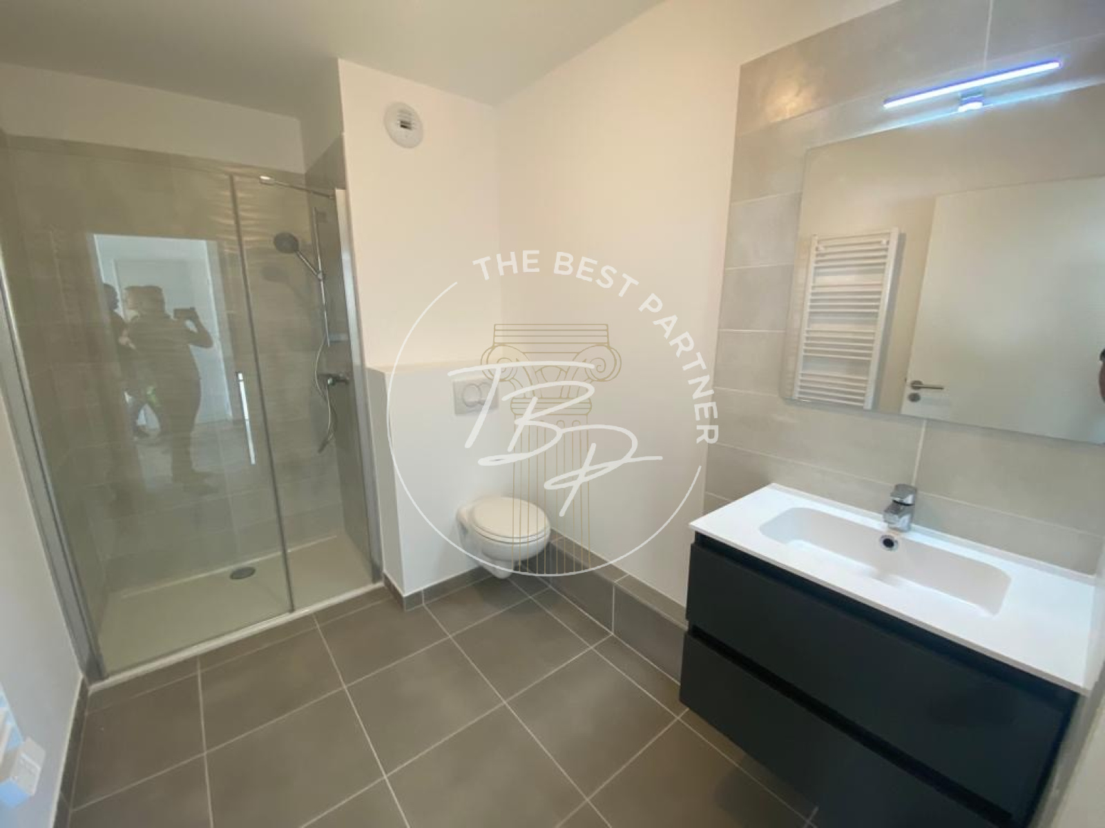 Une grande salle d’eau moderne avec douche à l’italienne, meuble vasque et WC suspendu